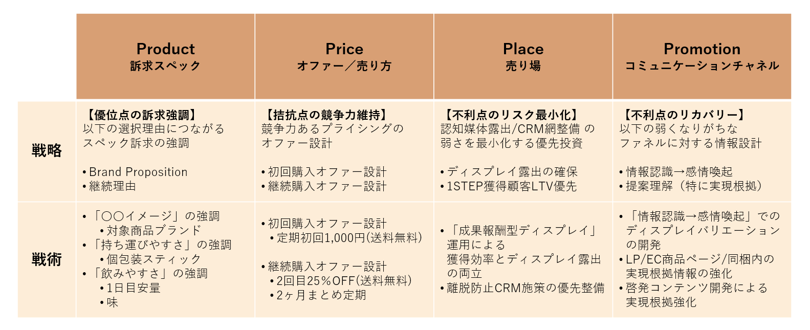 今回のマーケティング戦略/戦術の策定では、4Pそれぞれで競合商品との比較分析を行い、3つの観点(優位性を高める・条件を拮抗させる・不利を補う)から戦略/戦術を設計しました。
