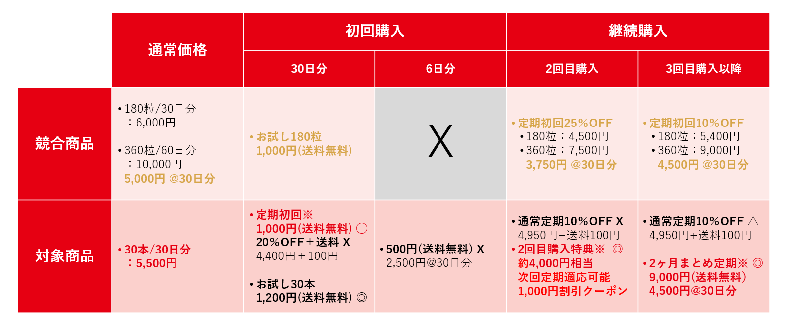 リニューアル前は、初回・継続いずれのオファーも競合商品に見劣りし、機能性便益でも大差がない中でPriceが最重要領域となっていました。そこで、下記項目で比較分析を行い、条件面の整備に着手しました。