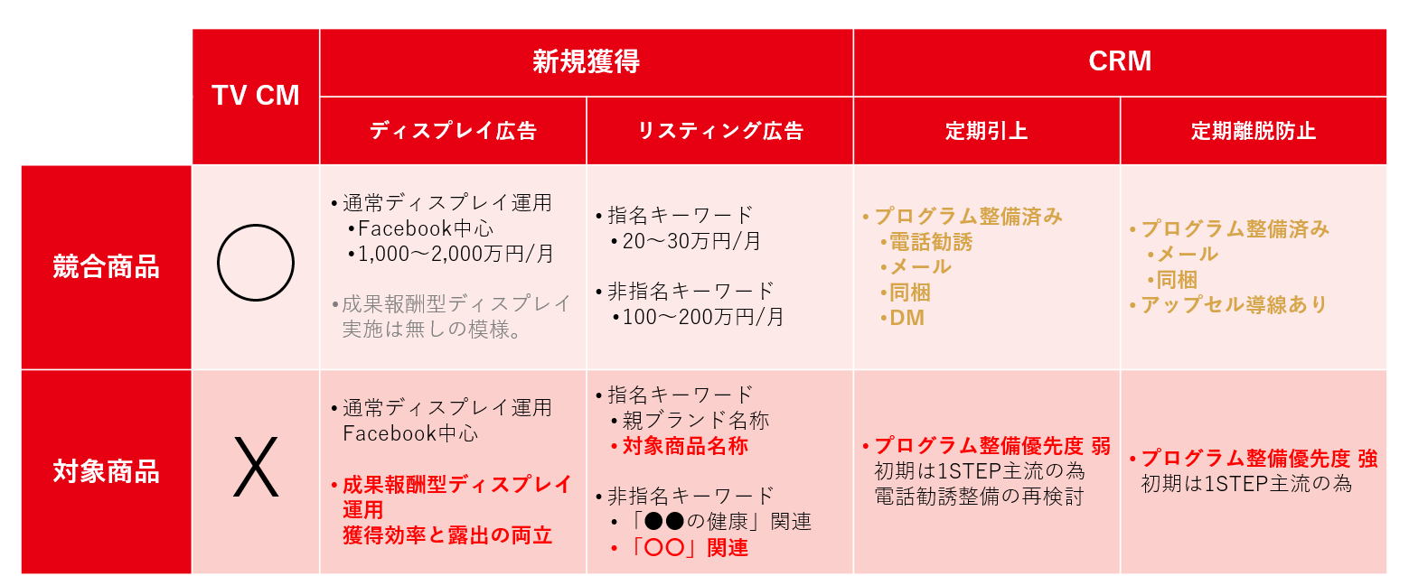 競合商品はTVCMによる高い認知力と潤沢な広告予算、広範なCRM網を持っていました。これに対して対象商品は露出量やCRMの整備で不利があり、特に新規獲得と継続維持の両面でリスクが確認されました。比較分析は下記観点で実施しました。
