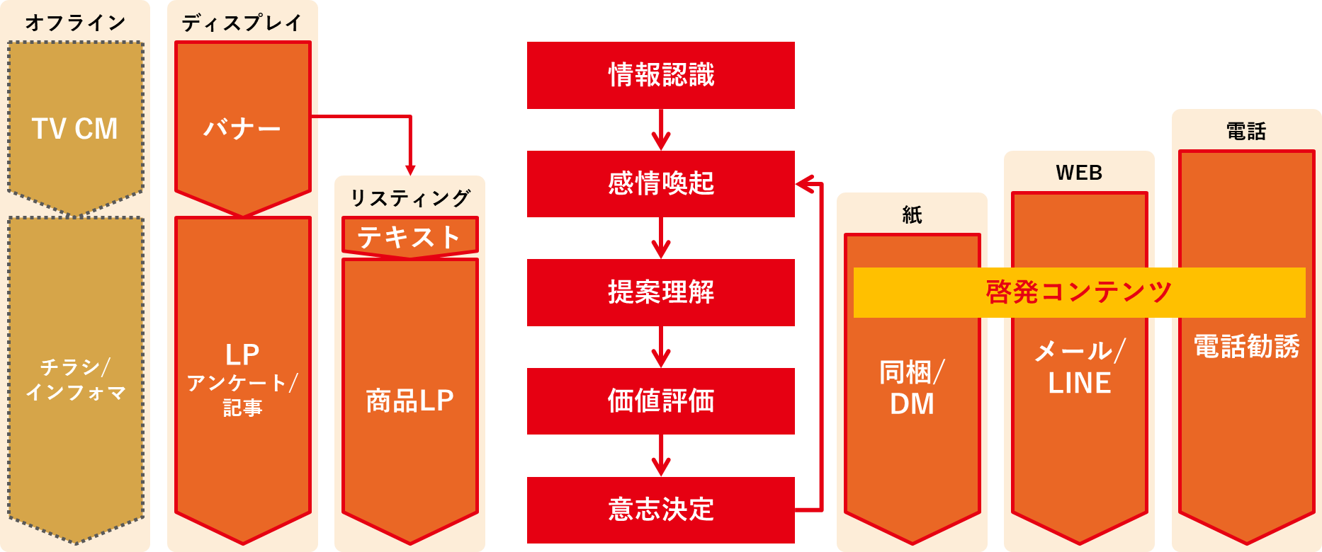 - 新規獲得:オフライン/ディスプレイ広告/リスティング広告