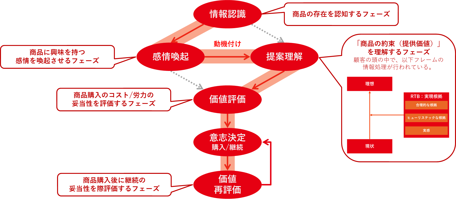 本モデルの特徴は、「情報認識」からすぐ「提案理解」に進むより、「感情喚起」を迂回してから提案理解へ進む方が、購入・継続の確率が上がる点にあります。