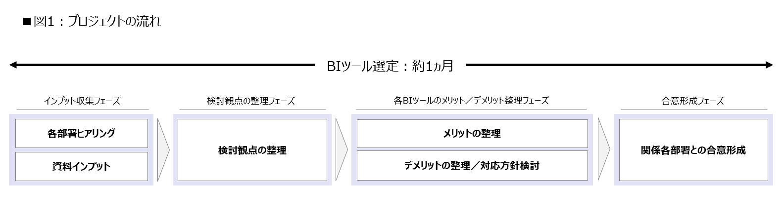 - 成果詳細な現状分析と多角的な比較検討を経て、最適なBIツールと利用方針をクライアントにご提案し、関係各署との合意に至った。