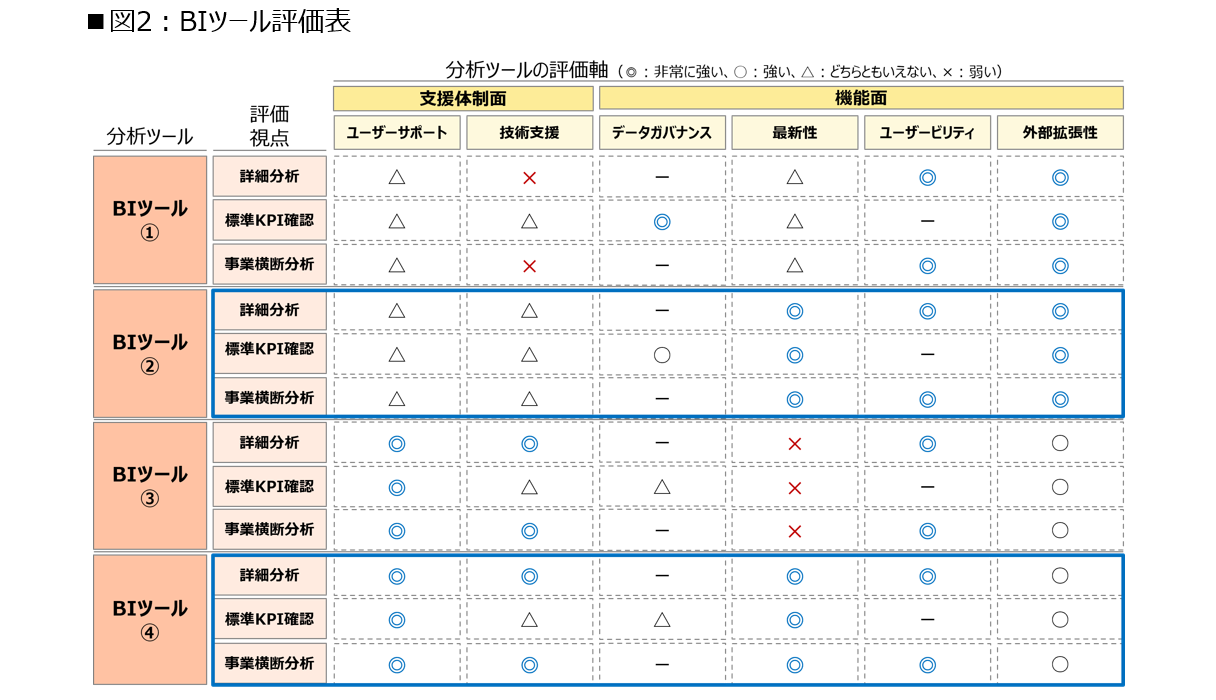 本状況を受け、弊社には、各BIツールの特性と課題を詳細に把握/比較し、最適な分析環境の提案を行うことが求められた。