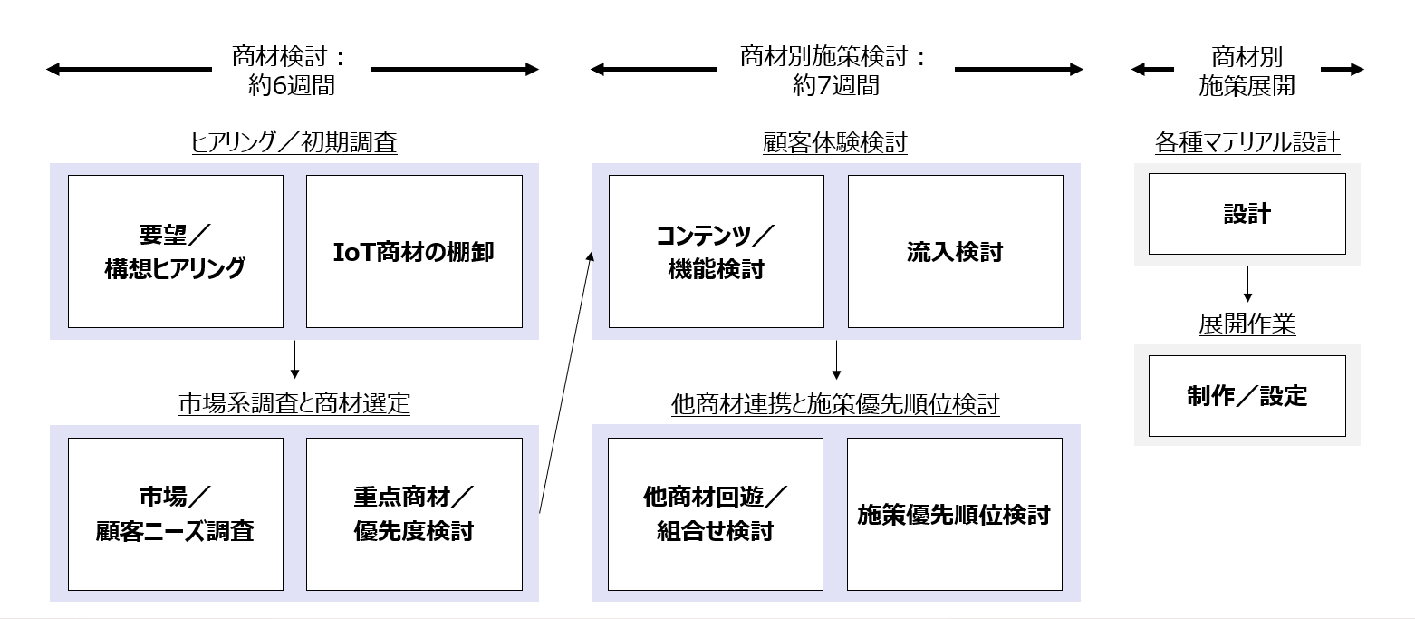 商材検討/商材別施策検討/商材別施策展開の3つのフェーズに分けてプロジェクトを実行した。