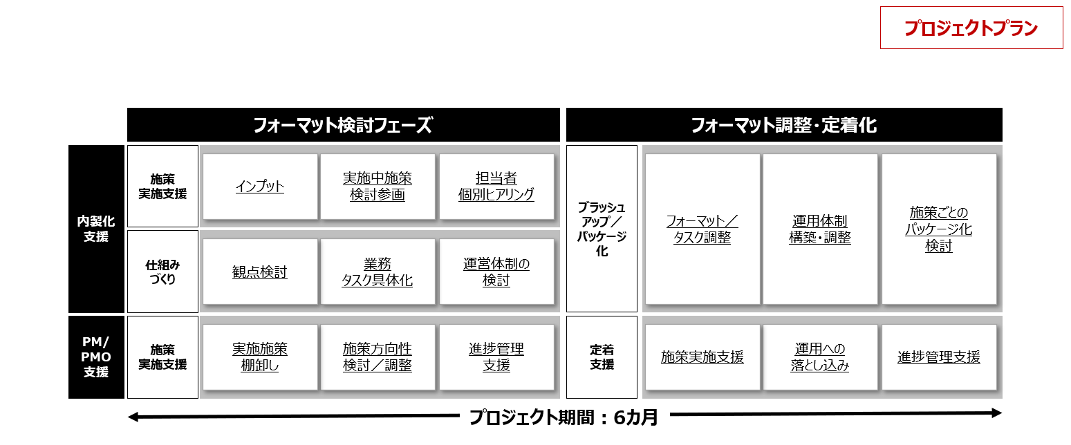 本プロジェクトでは、クライアントの部署内で実施中の施策や案件にもとづき、各施策・案件の進行に必要な知識や、考え方、進め方についてフォーマット化を行った。